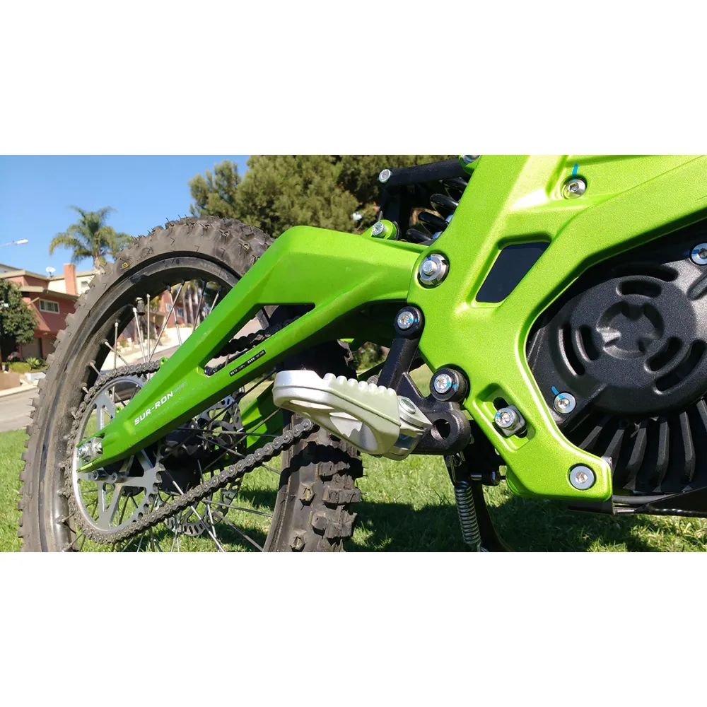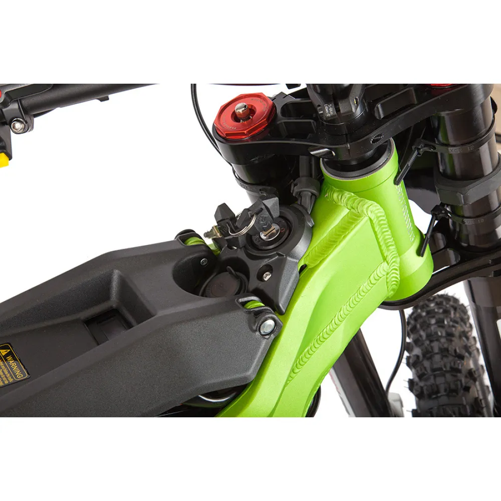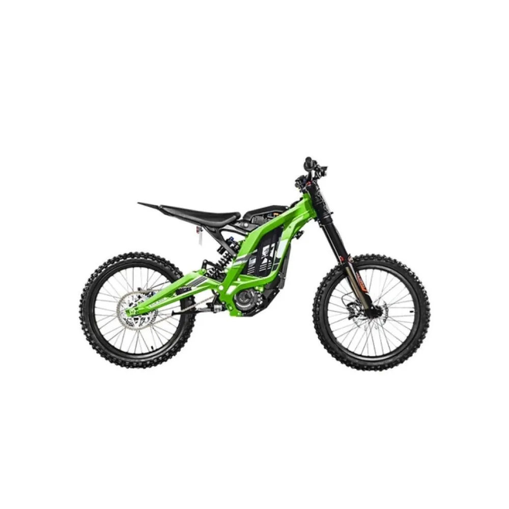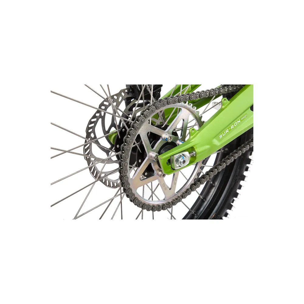 Электропитбайк SUR RON X в зелёной расцветке создан для быстрой езды по дорогам. Он спокойно проедет по грунтовой дороге, не застрянет в песке и ему не страшны горки.