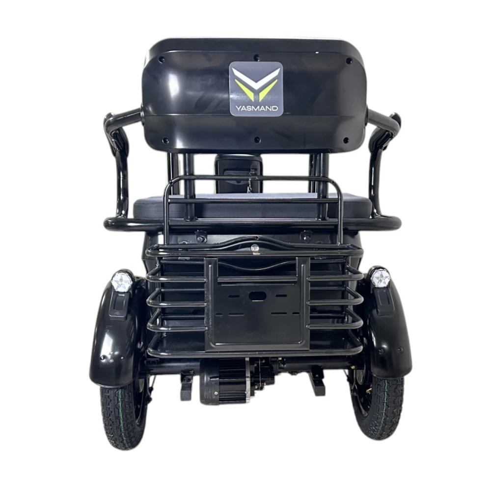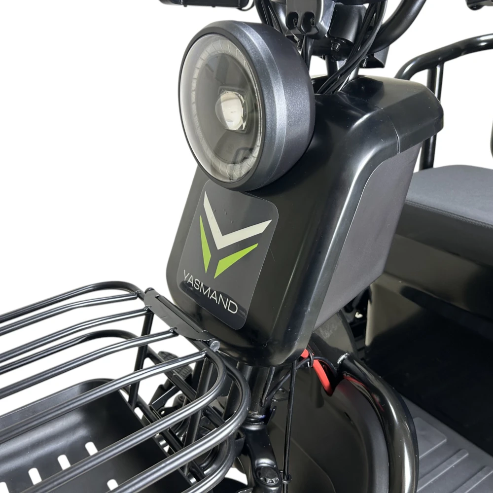 Yasmand R12 — трёхколёсный электротрицикл с задним приводом и мотором 1200 Вт. Он развивает скорость до 50 км/ч и обеспечивает комфортное передвижение по городу и на ровных загородных дорогах.