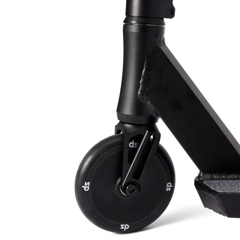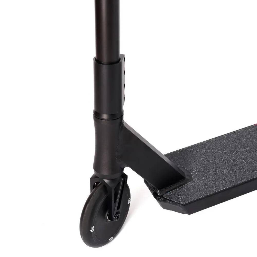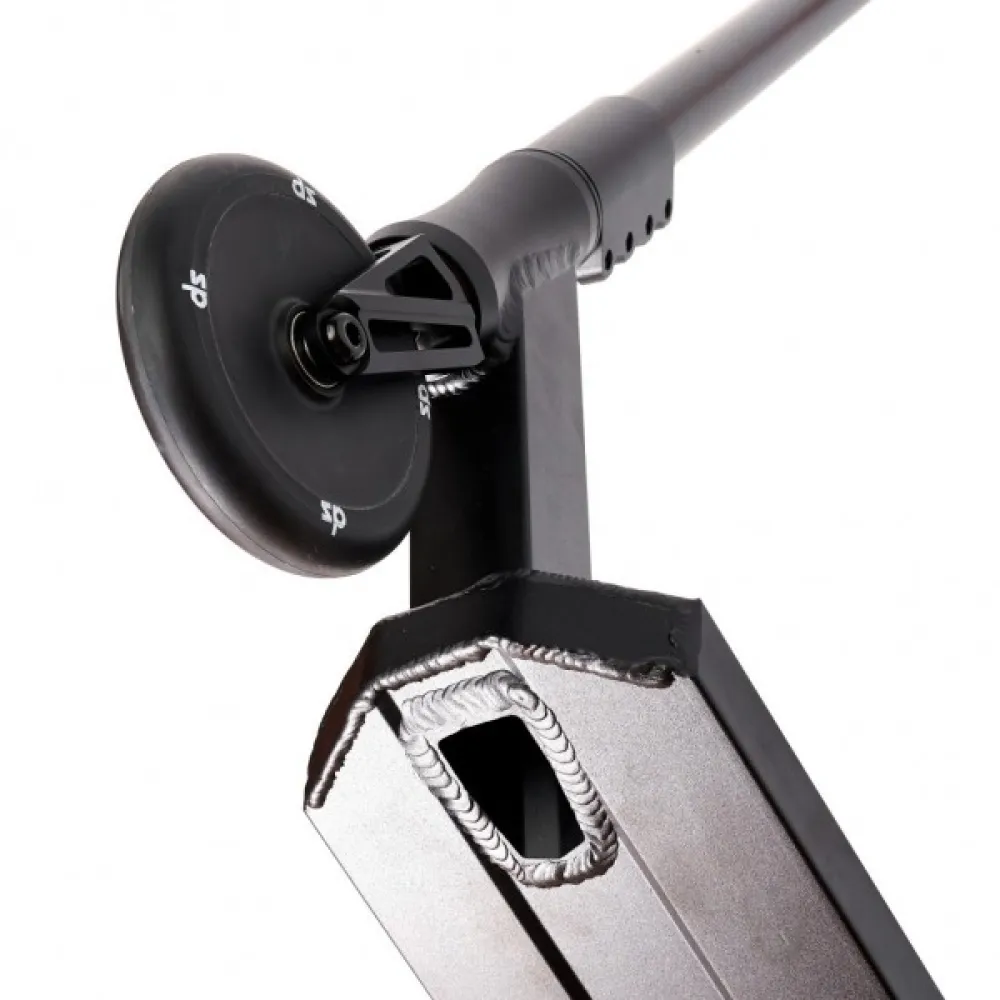 Легкий вес – 4,35 кг выдерживает максимальную нагрузку подростков и взрослых пользователей до 100 кг. Идеально подходит для начинающих райдеров и трюкачей среднего уровня профессионализма. Т-образная форма руля высотой 720 мм рассчитана на райдеров с разными ростовыми параметрами. При необходимости может быть заточена пользователями. 120-мм полиуретановые колеса жесткостью 88А оснащены инновационными подшипниками, обещающими максимальный разгон, важный при прыжках. Наличие в конструкции фендера исключает прямой контакт ног трюкача с колесами в период их вращения.